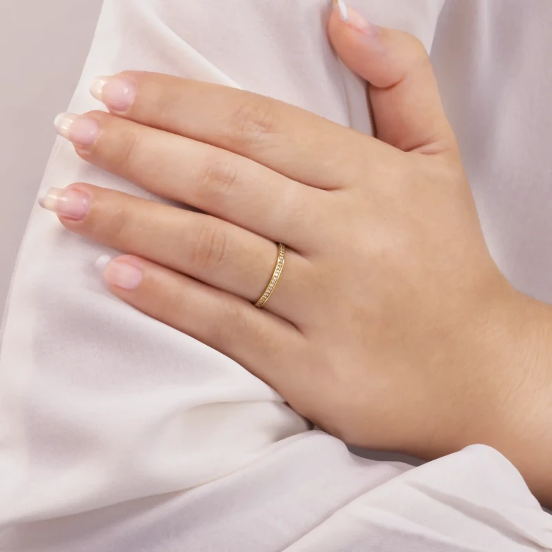 A stunning choice for the one, our Semi-Eternity Ring showcases sophistication and glamour. Adorn your finger with this elegant band, featuring meticulously set gemstones that sparkle with every movement. Celebrate your love with a piece that radiates enduring beauty and commitment.